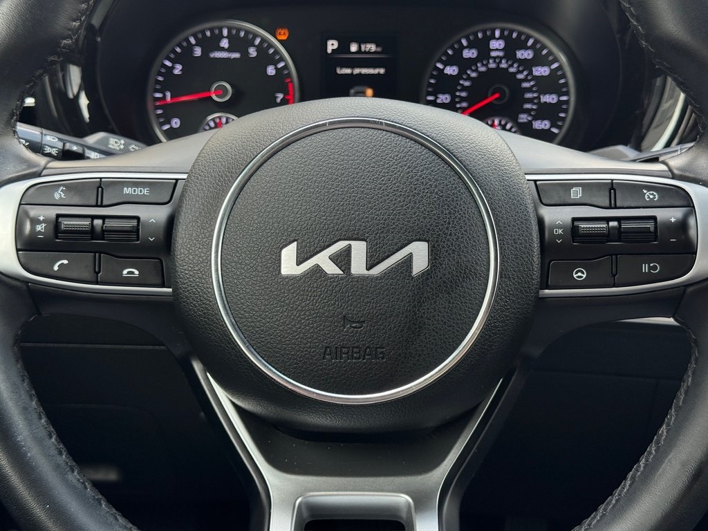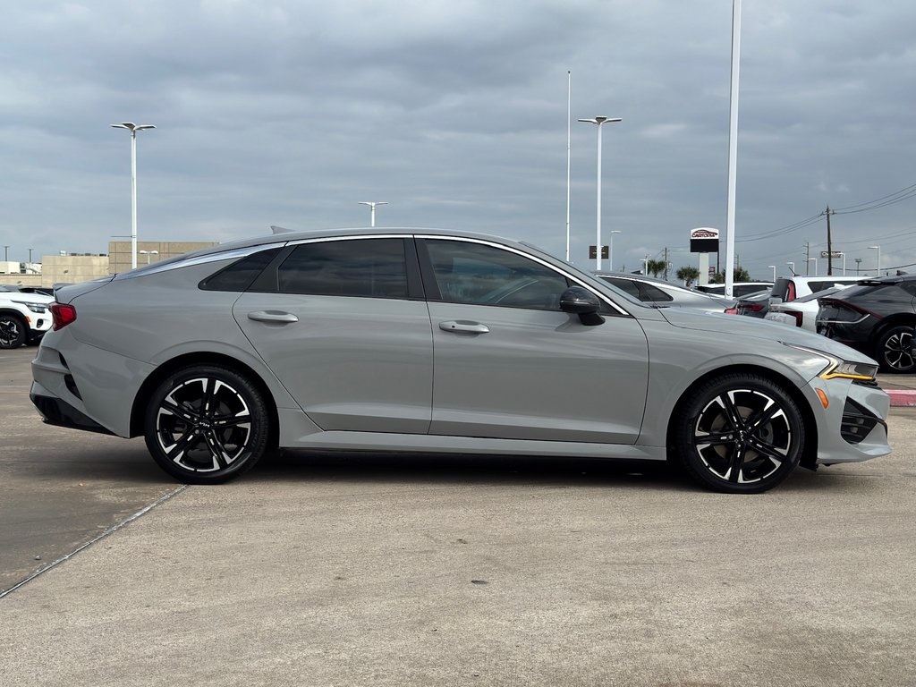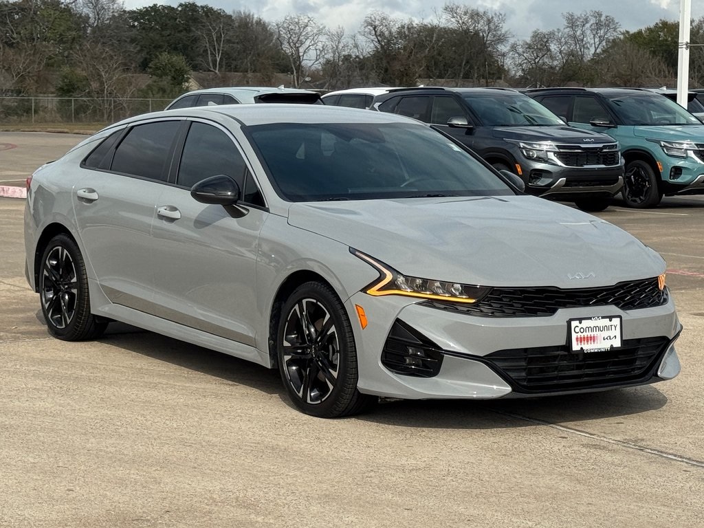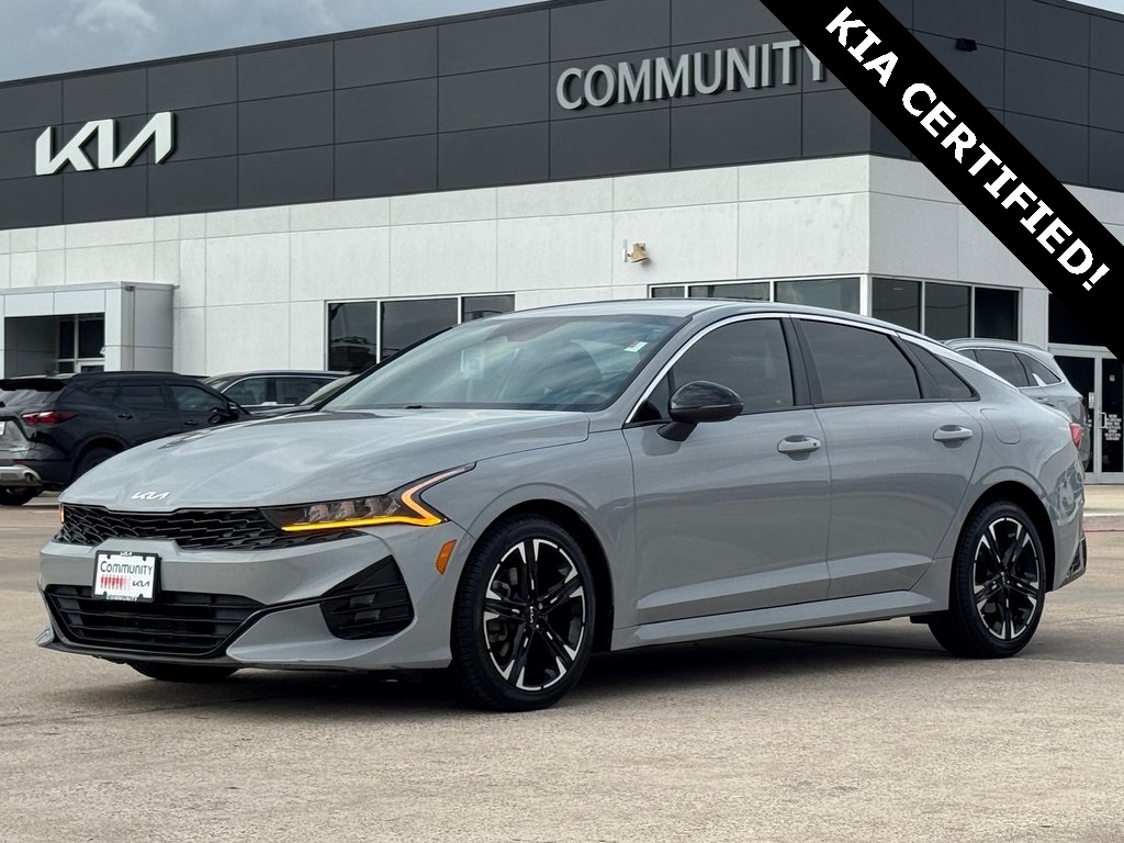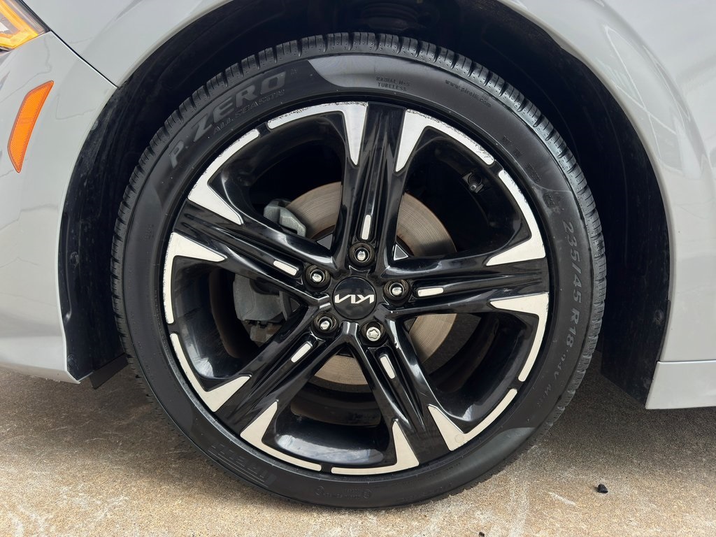 One stand-out feature of this Certified Pre-Owned 2023 Kia K5 GT-Line is its aggressive sport-inspired styling, featuring the iconic Wolf Gray finish, 18-inch gloss black machined wheels, and a leather-wrapped flat-bottom sport steering wheel that makes every drive feel like a performance event.