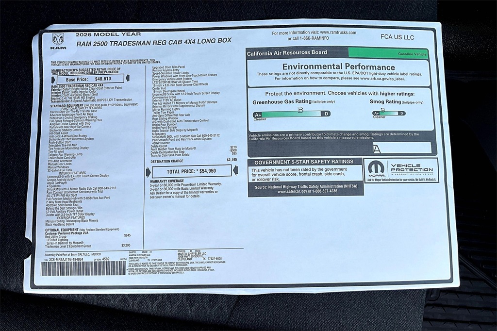 Bright White Clearcoat 2026 Ram 2500 Tradesman 4WD 8-Speed Automatic 6.4L V8 Prices do not include Tax, Title, License and Documentary Fee. Price does include: $1000 - 2026 National Bonus Cash . Exp. 02/02/2026 $2000 - 2026 National Select Inventory Bonus Cash. Exp. 02/02/2026