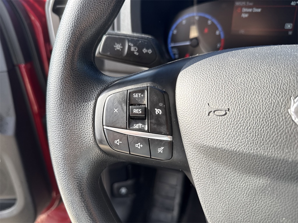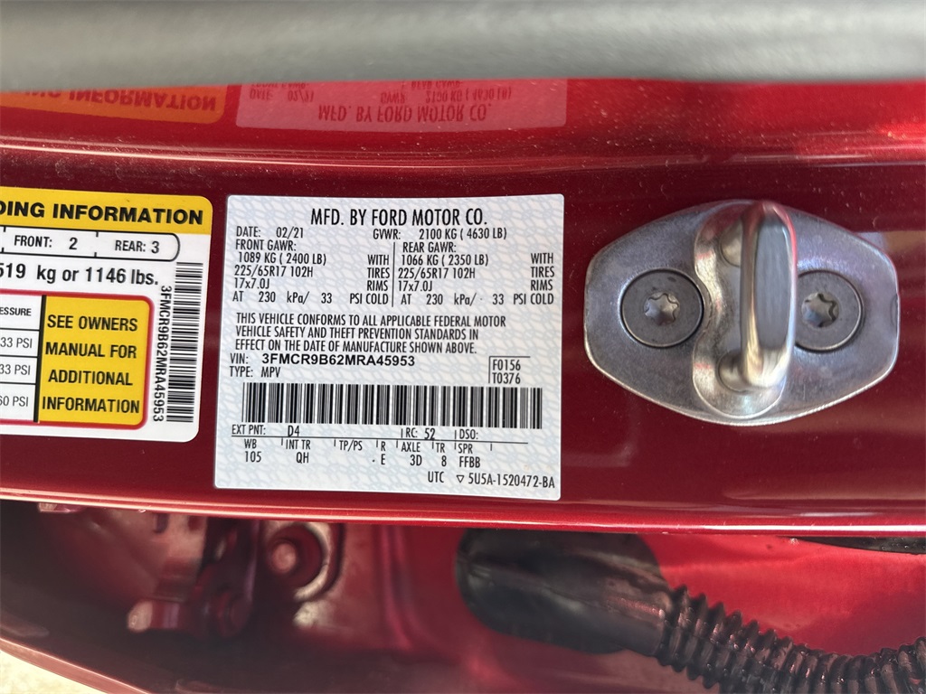 hts, Driver door bin, Driver vanity mirror, Dual front impact airbags, Dual front side impact airbags, Electronic Stability Control, Emergency communication system: SYNC 3 911 Assist, Exterior Parking Camera Rear, Four wheel independent suspension, Front anti-roll bar, Front Bucket Seats, Front Center Armrest, Front fog lights, Front reading lights, Fully automatic headlights, Heated door mirrors, Illuminated entry, Knee airbag, Low tire pressure warning, Occupant sensing airbag, Outside temperature display, Overhead airbag, Overhead console, Panic alarm, Passenger door bin, Passenger vanity mirror, Power door mirrors, Power steering, Power windows, Radio data system, Rear anti-roll bar, Rear reading lights, Rear seat center armrest, Rear window defroster, Rear window wiper, Remote keyless entry, Roof rack: rails only, Security system, SiriusXM Radio, Speed control, Speed-sensing steering, Speed-Sensitive Wipers, Split folding rear seat, Steering wheel mounted audio controls, SYNC 3 Communications & Entertainment System, SYNC 3/Apple CarPlay/Android Auto, Tachometer, Telescoping steering wheel, Tilt steering wheel, Traction control, Trip computer, Unique Cloth Front Bucket Seats, Variably intermittent wipers, and Wheels: 17" Carbonized Gray-Painted Aluminum.