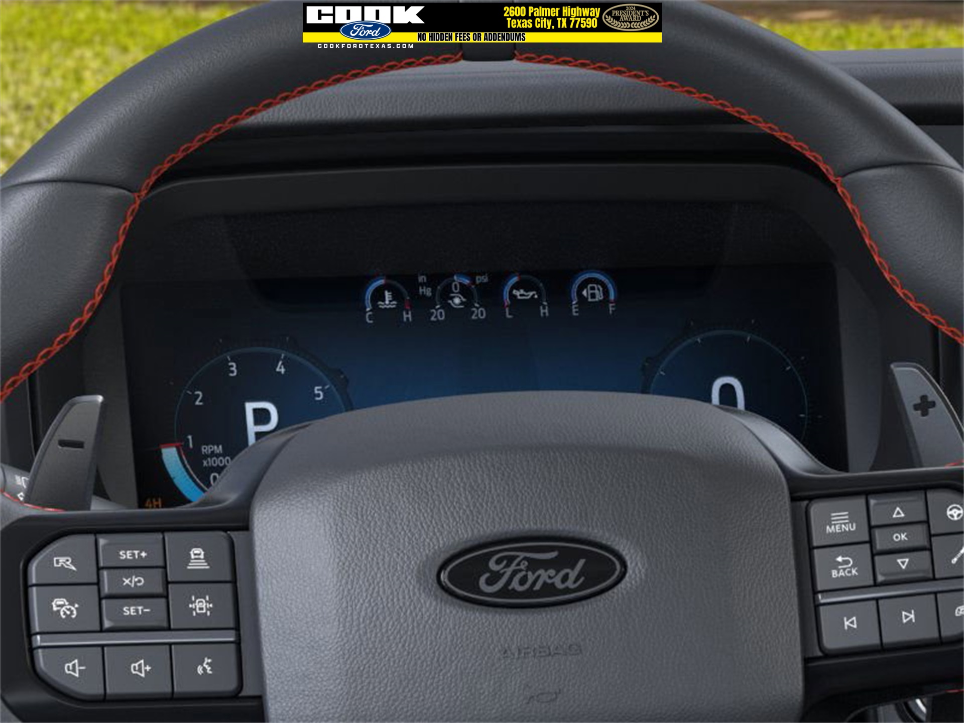 s, AM/FM radio: SiriusXM with 360L, Auto High-beam Headlights, Auto tilt-away steering wheel, Auto-dimming door mirrors, Auto-dimming Rear-View mirror, Automatic temperature control, Brake assist, Bumpers: body-color, Compass, Delay-off headlights, Driver door bin, Driver vanity mirror, Dual front impact airbags, Dual front side impact airbags, Electronic Locking w/4.10 Axle Ratio, Electronic Stability Control, Emergency communication system: SYNC 4 911 Assist, Front anti-roll bar, Front Bucket Seats, Front Center Armrest, Front dual zone A/C, Front fog lights, Front reading lights, Front wheel independent suspension, Fully automatic headlights, Garage door transmitter, Heads-Up Display, Heated door mirrors, Heated Front Seats, Heated rear seats, Heated steering wheel, Illuminated entry, Lane Departure Warning System, Leather steering wheel, Leather Trimmed Seats, Low tire pressure warning, Memory seat, Navigation system: Connected Navigation, Occupant sensing airbag, Outside temperature display, Overhead airbag, Overhead console, Panic alarm, Passenger door bin, Passenger vanity mirror, Pedal memory, Power door mirrors, Power driver seat, Power passenger seat, Power steering, Power windows, Radio data system, Radio: B&O Unleashed Sound System by Bang & Olufsen, Rain sensing wipers, Rear reading lights, Rear step bumper, Rear window defroster, Remote keyless entry, Security system, Speed control, Speed-sensing steering, Split folding rear seat, Steering wheel memory, Steering wheel mounted audio controls, SYNC 4 w/Enhanced Voice Recognition, Tachometer, Telescoping steering wheel, Tilt steering wheel, Tough Bed Spray-In Bedliner, Traction control, Trip computer, Turn signal indicator mirrors, Twin Panel Moonroof, Variably intermittent wipers, and Ventilated front seats.