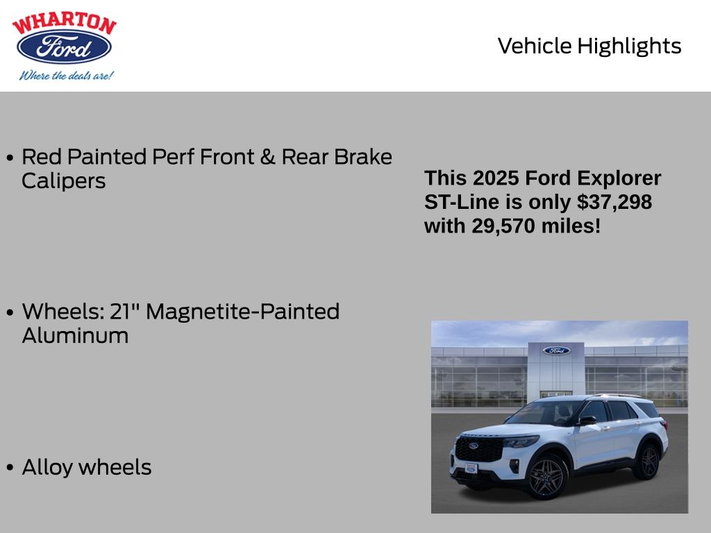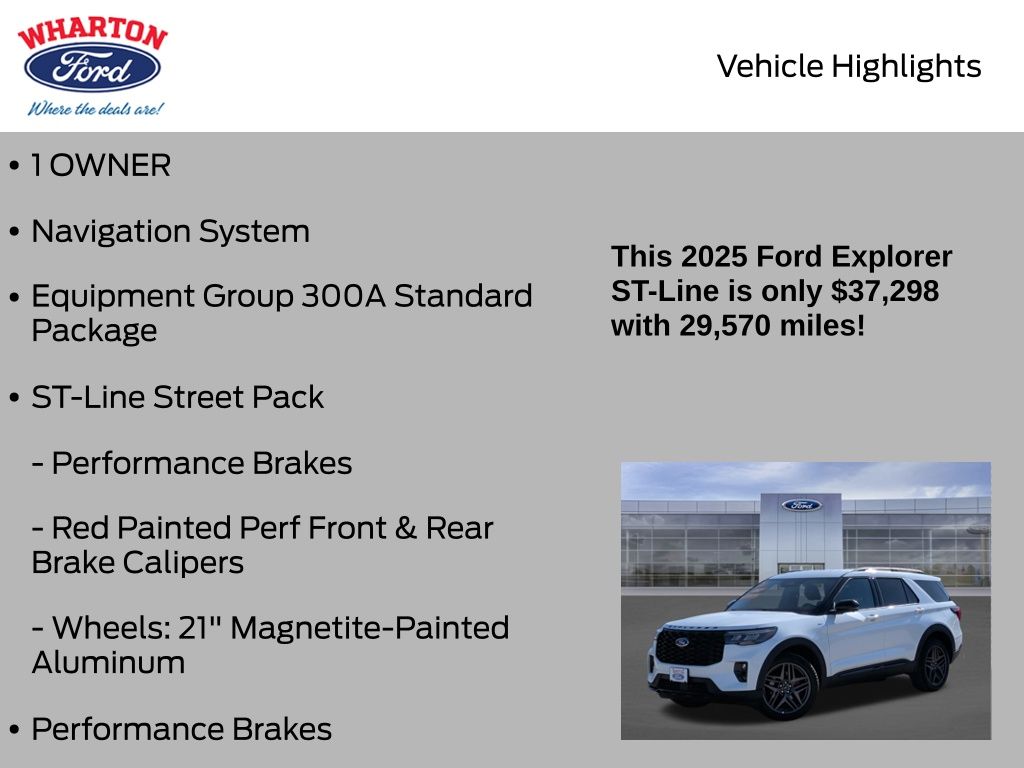 Certified. Star White Metallic Tri-Coat 2025 Ford Explorer ST-Line 4WD 10-Speed Automatic 2.3L EcoBoost I-4 1 OWNER, 4WD, Alloy wheels, Equipment Group 300A Standard Package, Navigation System, Performance Brakes, Red Painted Perf Front & Rear Brake Calipers, ST-Line Street Pack, Wheels: 21" Magnetite-Painted Aluminum.