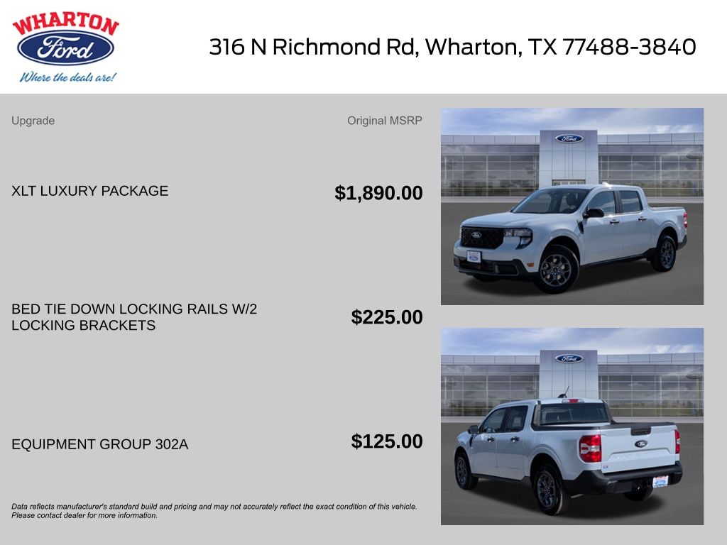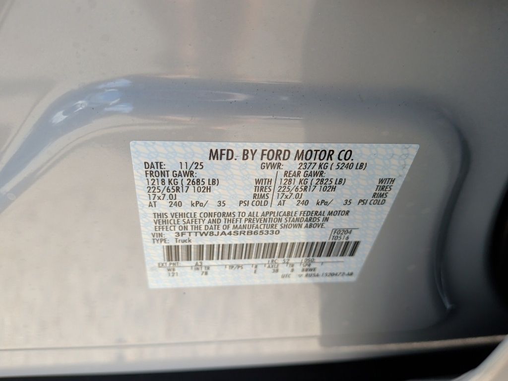 y/Android Auto, Auto High Beams, Auto High-beam Headlights, Automatic temperature control, Bed Tie Down Locking Rails w/2 Locking Brackets, Brake assist, Bumpers: body-color, Compass, Delay-off headlights, Driver door bin, Driver vanity mirror, Dual front impact airbags, Dual front side impact airbags, Electronic Stability Control, Emergency communication system: SYNC 4 911 Assist, Exterior Parking Camera Rear, Four wheel independent suspension, Front anti-roll bar, Front Bucket Seats, Front Center Armrest, Front reading lights, Fully automatic headlights, Illuminated entry, Knee airbag, Low tire pressure warning, Occupant sensing airbag, Outside temperature display, Overhead airbag, Overhead console, Panic alarm, Passenger door bin, Passenger vanity mirror, Power door mirrors, Power steering, Power windows, Pre-Collision Assist w/Automatic Emergency Braking, Radio data system, Radio: AM/FM Stereo w/6 Speakers, Rear anti-roll bar, Rear seat center armrest, Rear step bumper, Rear-View Camera, Remote keyless entry, Security system, SiriusXM w/360L, Speed control, Speed-sensing steering, Steering wheel mounted audio controls, SYNC 4 w/Enhanced Voice Recognition, Telescoping steering wheel, Tilt steering wheel, Traction control, Trip computer, Unique Cloth Front Bucket Seats, and Wheels: 17" Carbonized Gray Painted Aluminum. Price includes: $1000 - Black Friday Mega Bonus Cash. Exp. 12/01/2025 $1000 - Retail Customer Cash. Exp. 01/05/2026